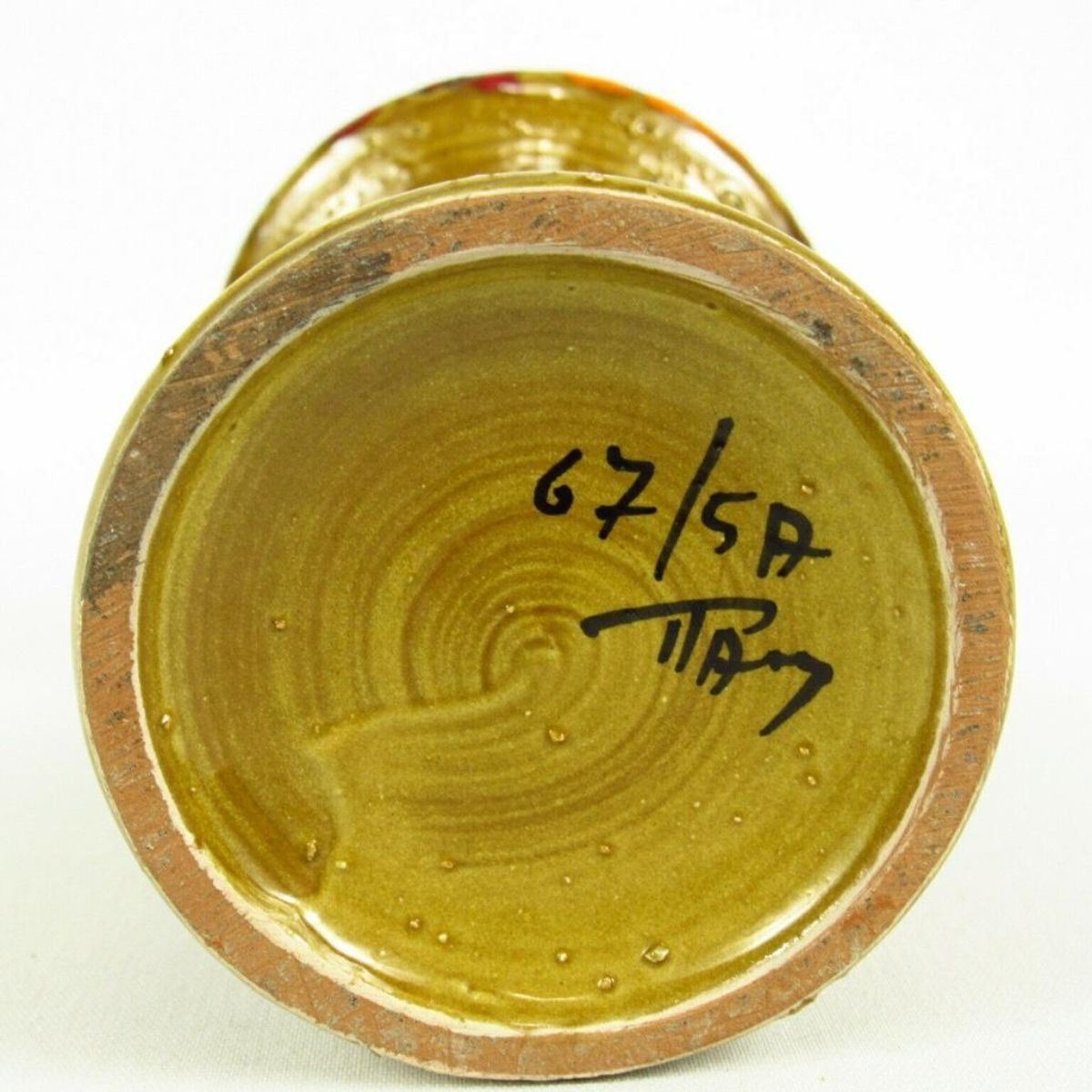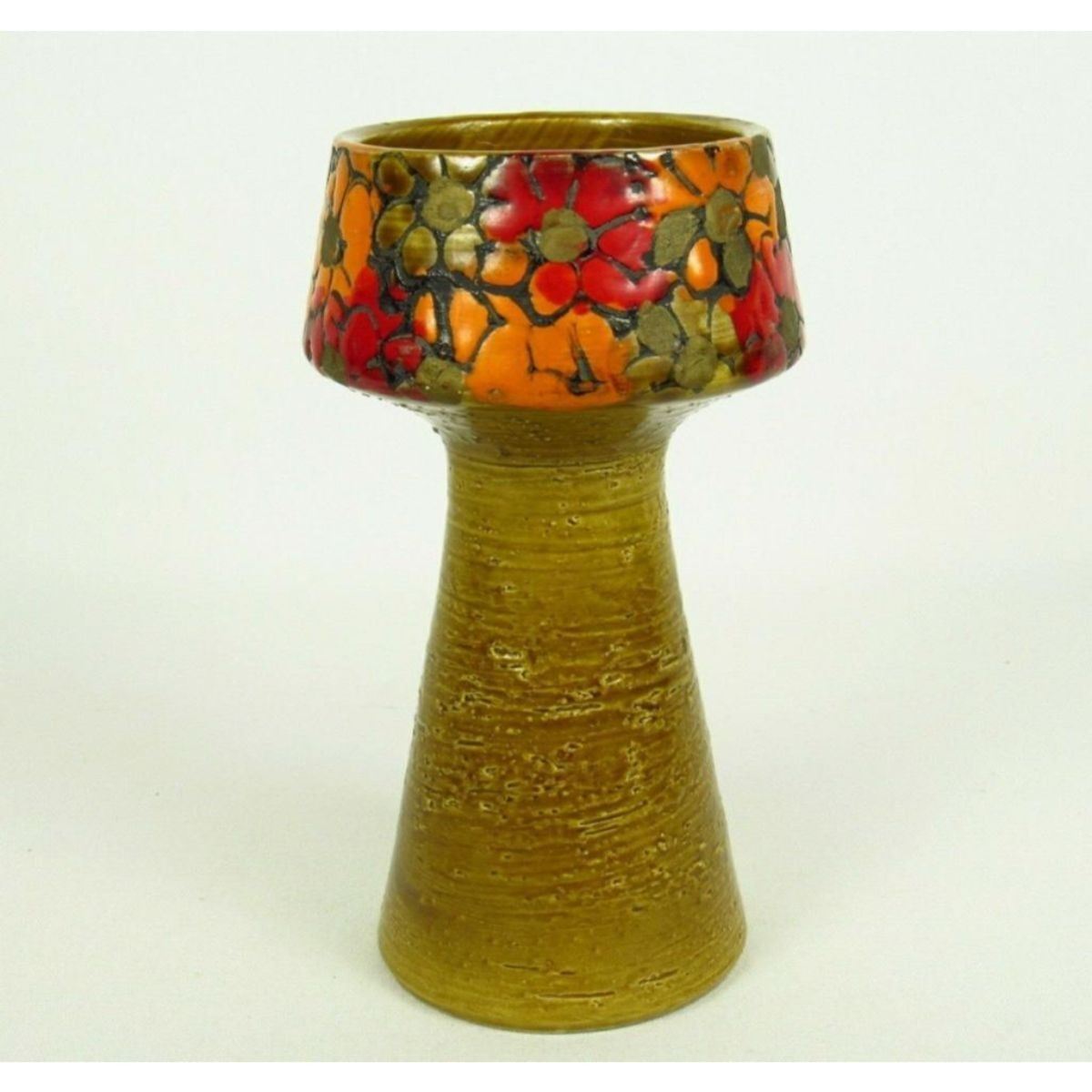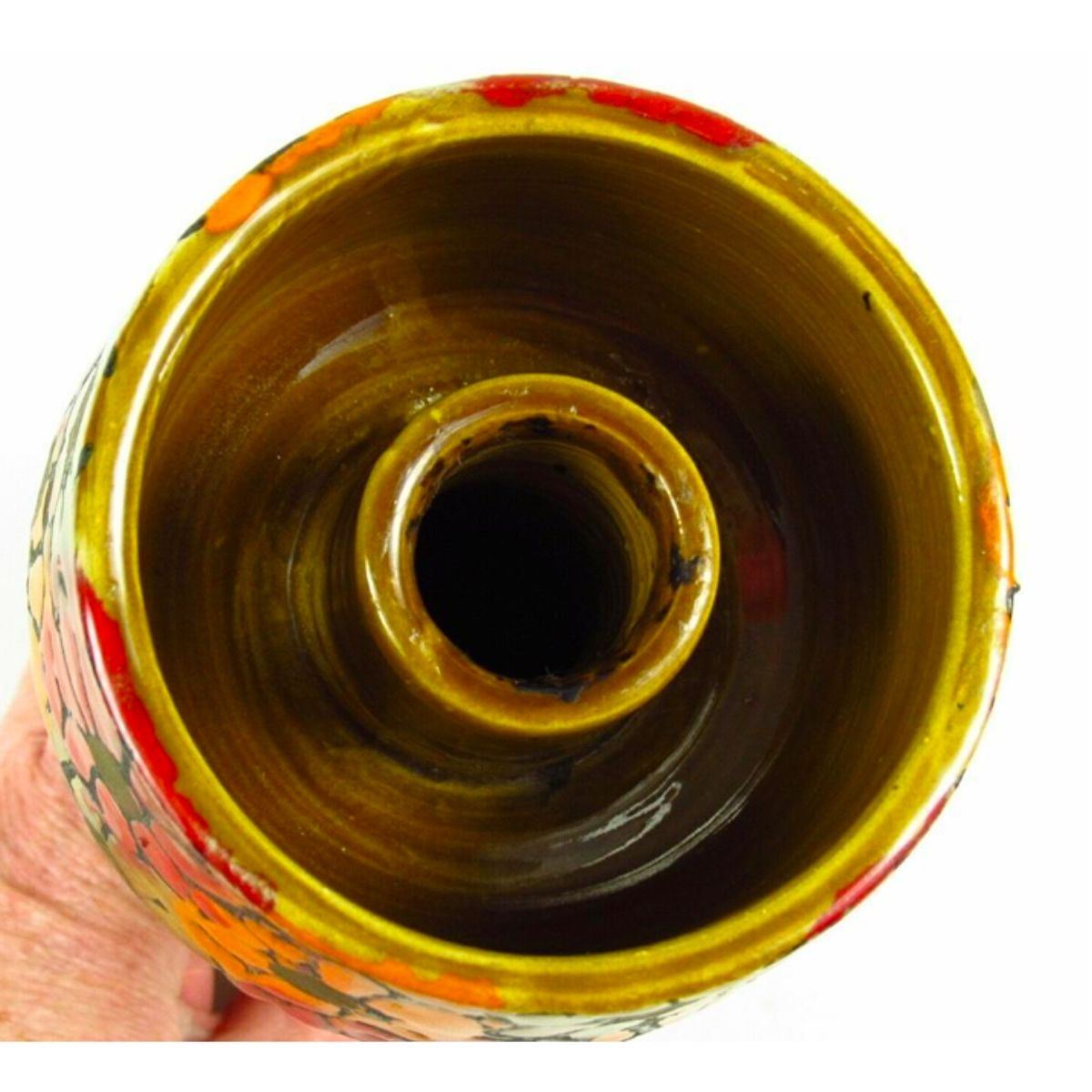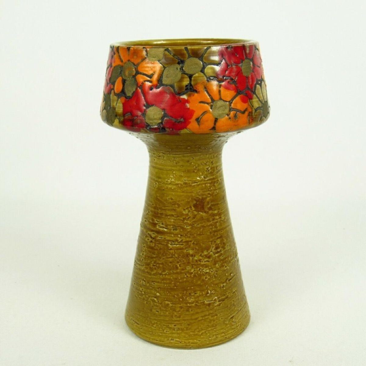 Mid-century modern, 1950's Italian signed Bitossi pottery candle holder with yellow undertone brown glaze with red & orange brutalist style flowers. Concave underside signed 67/5A Italy. 6 1/2" H X 3 1/2" D.Â