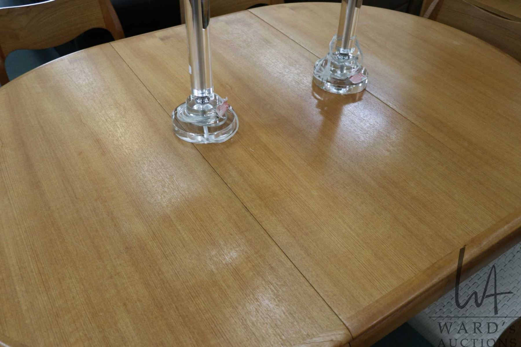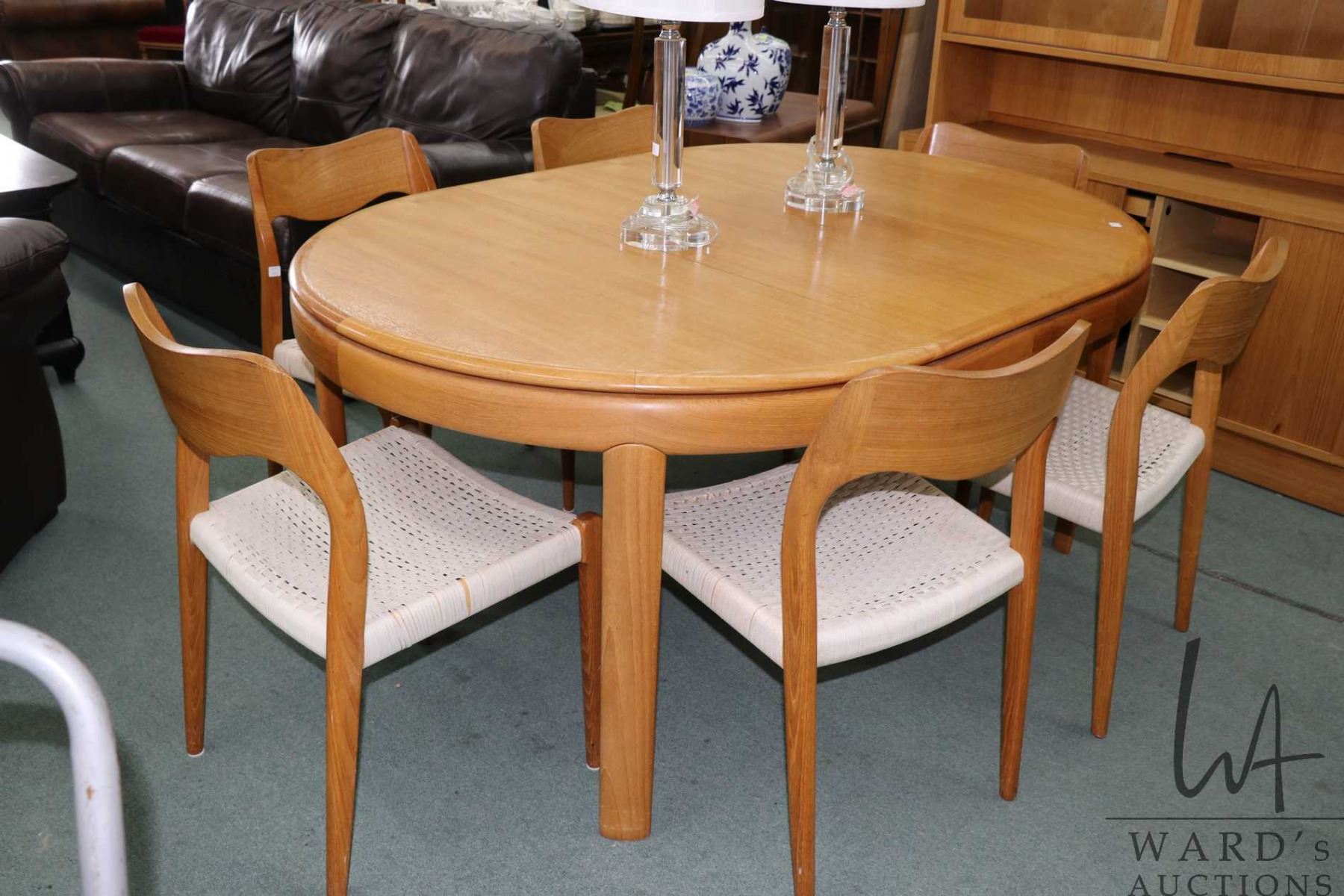Mid century modern 45" diameter dining table with 19 1/2" wide skirted insert leaf and six Danish J.L. Mobler made in Denmark dining chairs with woven seats