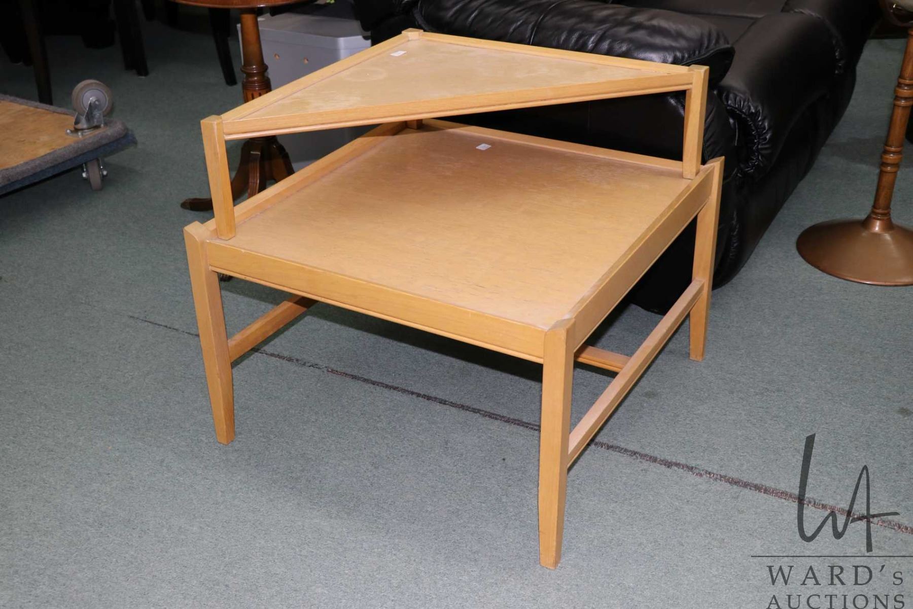 Mid century modern Canadian made blonde oak two piece step up side table, 22" to upper level, 25" X 25" square