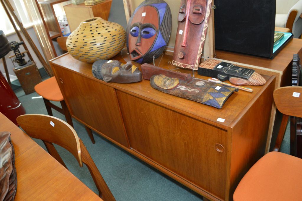Mid century modern teak sideboard with two sliding doors, one of which exposes two flatware drawers, no name found but from the same home as lot 214