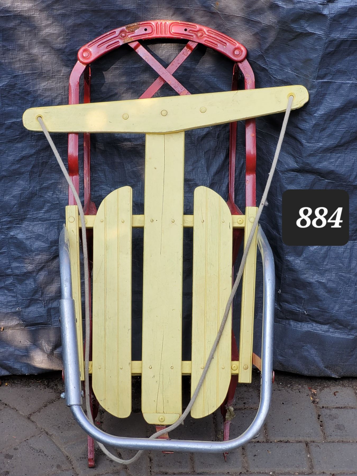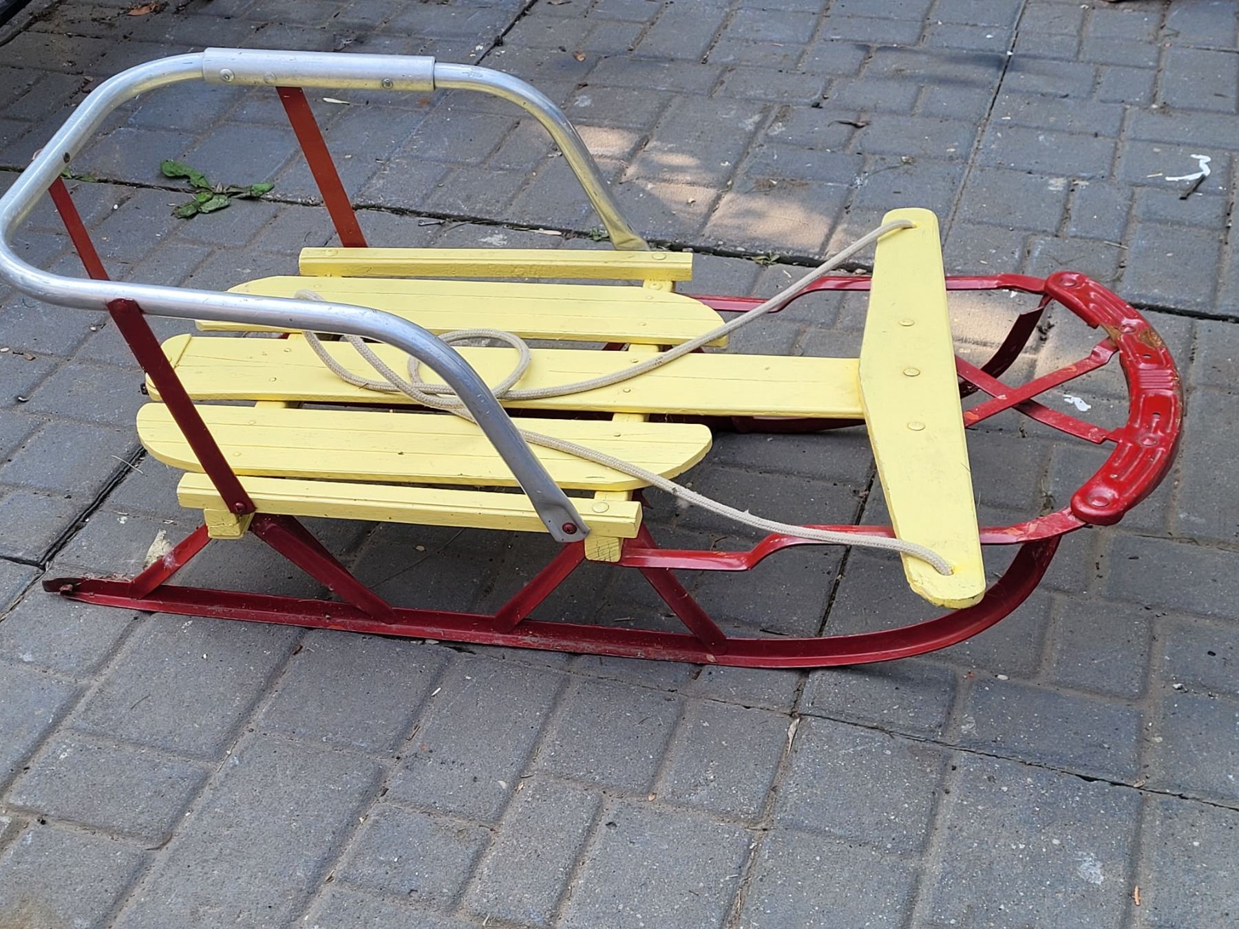 Mid century wood sled with metal rails.