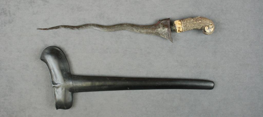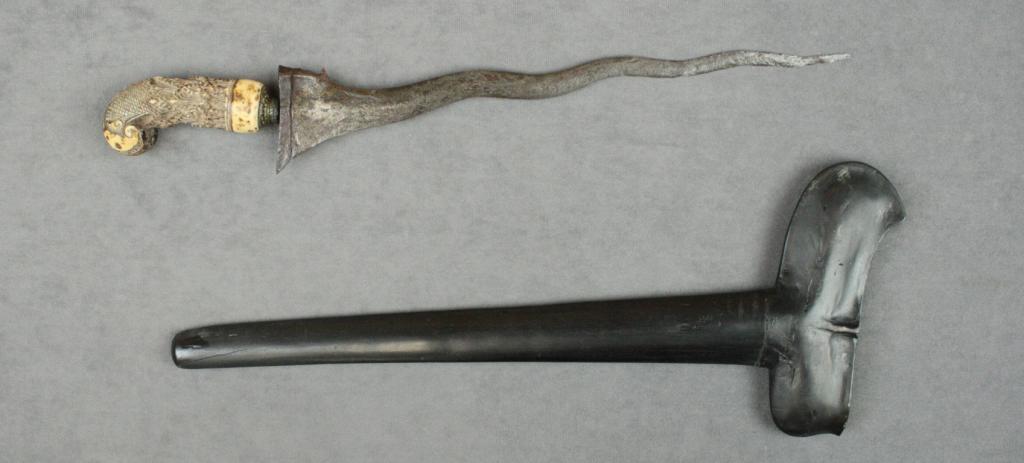 Mid-eastern Kris knife and wood sheath, approx. 19” overall with an approx. 13” wavy blade in overall fair condition showing age and an ornately carved bone grip; wood sheath overall good. Est.: $75-$150.