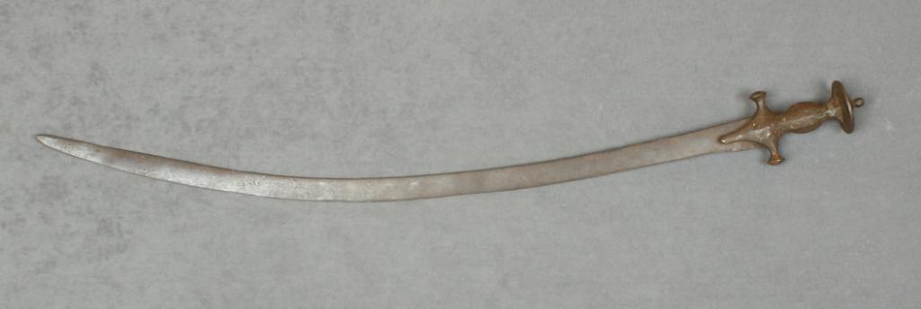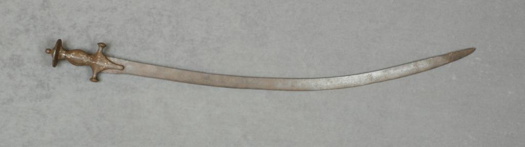 Mid-eastern Tulwar curved blade sword, approx. 35” overall; uncleaned and in overall fair condition showing a heavy dark patina to blade and integrated grip, cross guard and pommel. Est.: $150-$300.