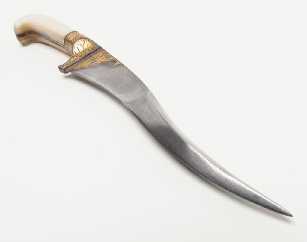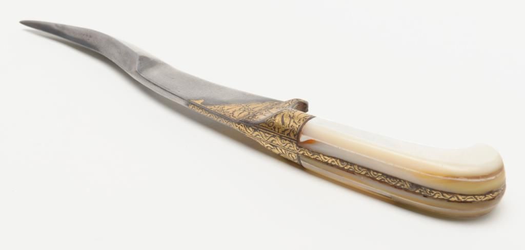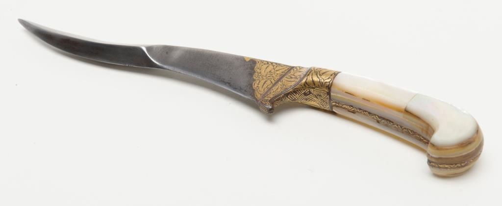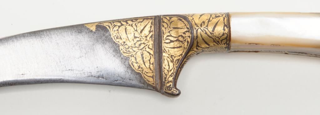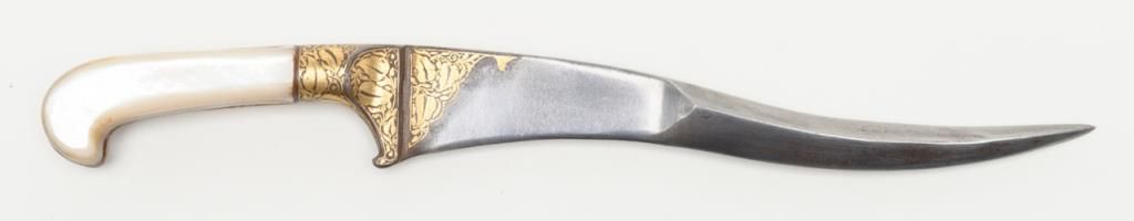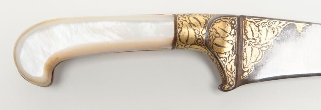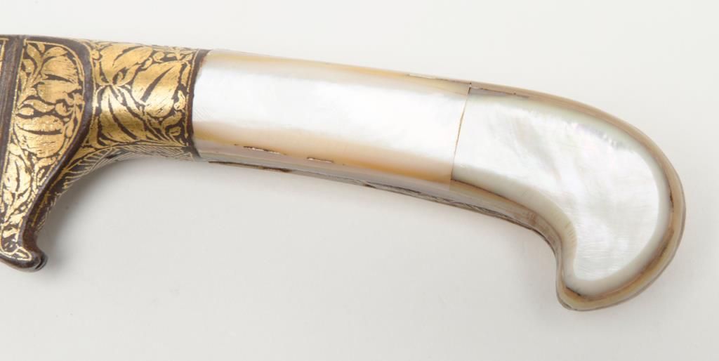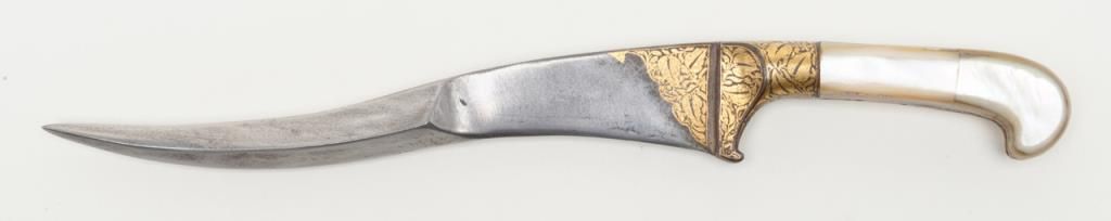 Mid-eastern armor piercing dagger with gold Damascene decoration and pearl grips circa 19th century. The dagger measures 12” overall with 7 and nearly ½” blade showing a reinforced tip for piercing armor. The blade has been cleaned andpolished and we cannot see if there is any Damascus pattern however it is definitely forged. The hilt area and grip is nicely gold Damascene. The grip scales are old pearl and one section on one side is made of two pieces with an almostimperceptible joint. The condition is very good plus to near fine overall with over cleaning to the blade. Est.: $375-$750