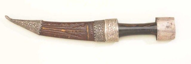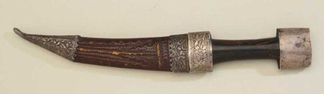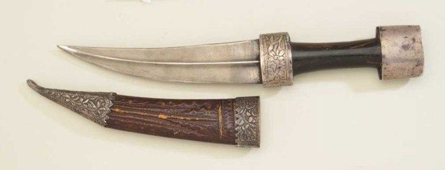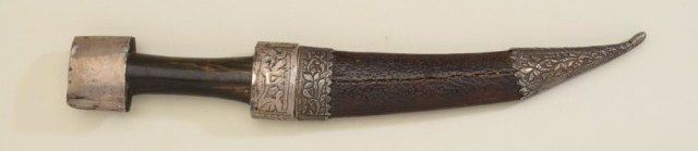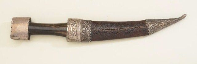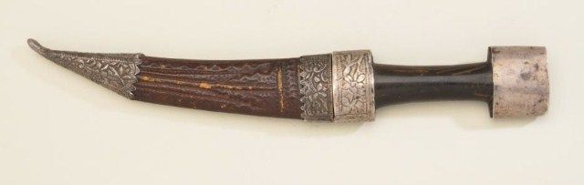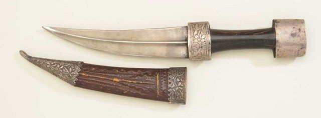 Mid-eastern dagger with horn grips and silver mounts, circa 19th century retaining its original scabbard. The dagger measures 13-1/4” overall with 8” blade showing a fine Damascus-type pattern in the watered steel.The grip is dark horn; the engraving on the mounts and hilt match except grip cap is plain with a matching dark patina. The scabbard is decorated and in good condition. Reportedly brought to the U.S. by Iranianimmigrant in the post-Shaw era. Est.: $400-$800.