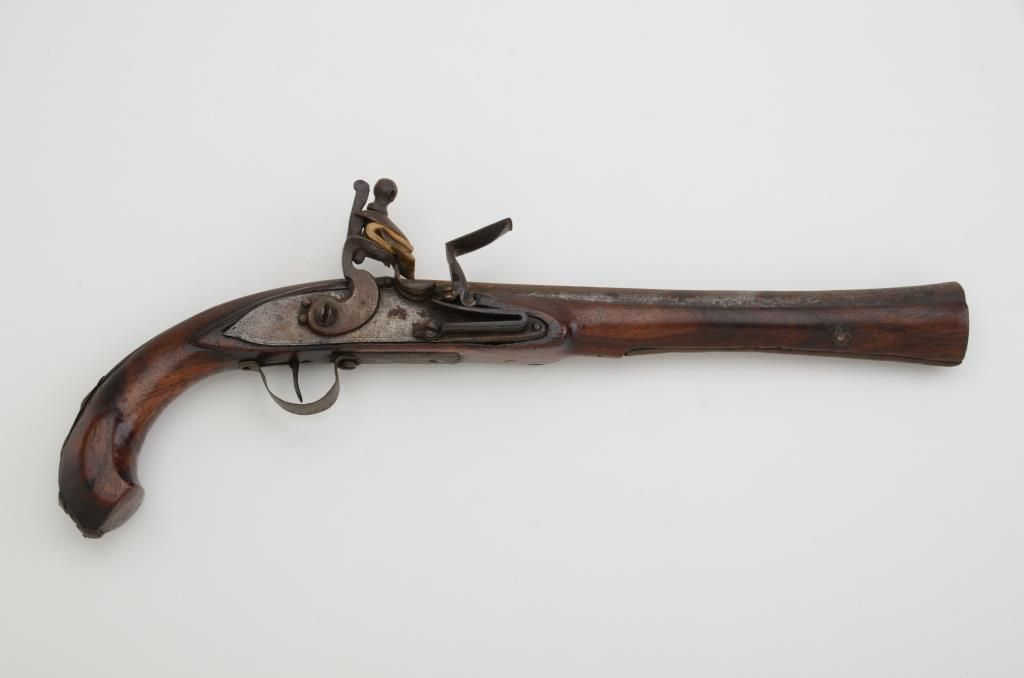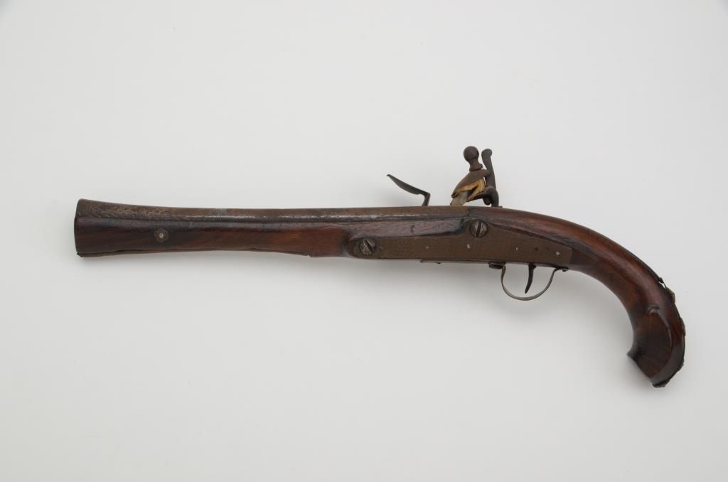 Mid-eastern style flared barrel flintlock pistol approx. 18” overall in uncleaned out-of-the-attic condition, decorated barrel and lockplate, simple decorated brass trigger guard, action workings, full length woodstock in overall good condition. Est.: $200-$400.