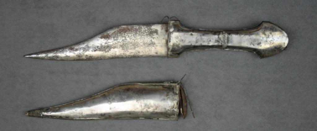 Mid-eastern style knife with metal sheath showing some age, approx. 11” overall well worn condition with simple engraving to grip and sheath, wire wrapping has come loose, sheath’s seams are separating. Est.:$50-$100.