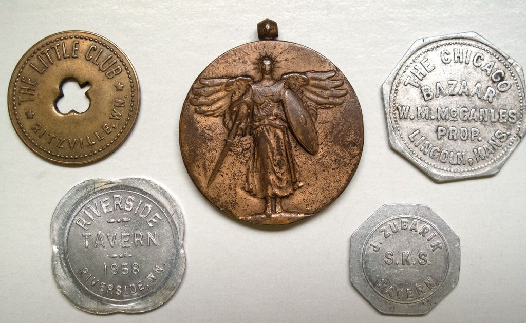 Lot of 5. 1) The Chicago Bazaar, Lincoln, Kansas, GF 50c IM. 2) Little Club, Ritzville, Wi, GF 5c IT. 3) Riverside Tavern. 1950, Riverside, Wi, GF 25c IT. 4) J Zuberik SKS Tavern, GF 5c in Drink. 5) WWII medal.