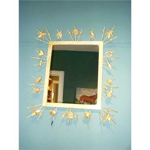 The mirror has various objects artfully attached with what look like big pins. The top middle decorative object is a sun, there are fish, and shoes and stars and horseshoes. It is gilted metal, and is in excellent condition. It measures 35 inches tall by 31 inches wide.