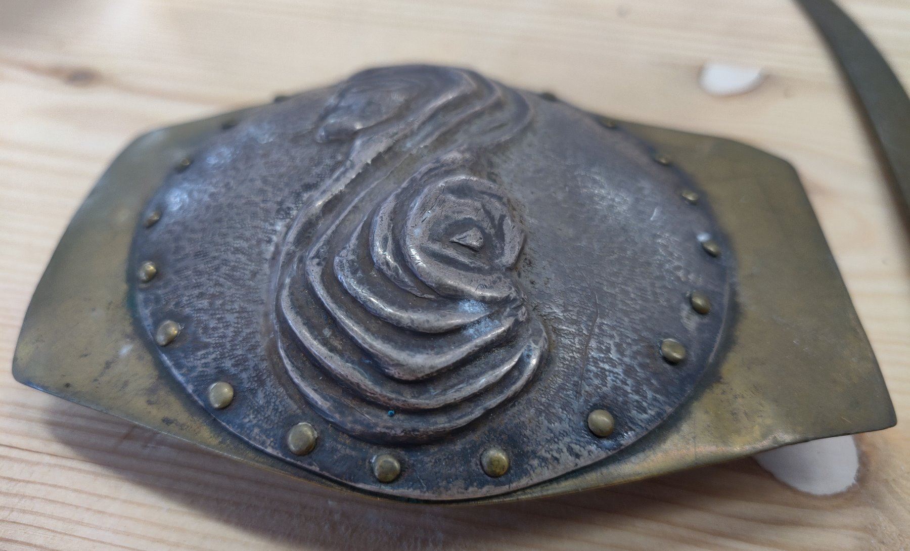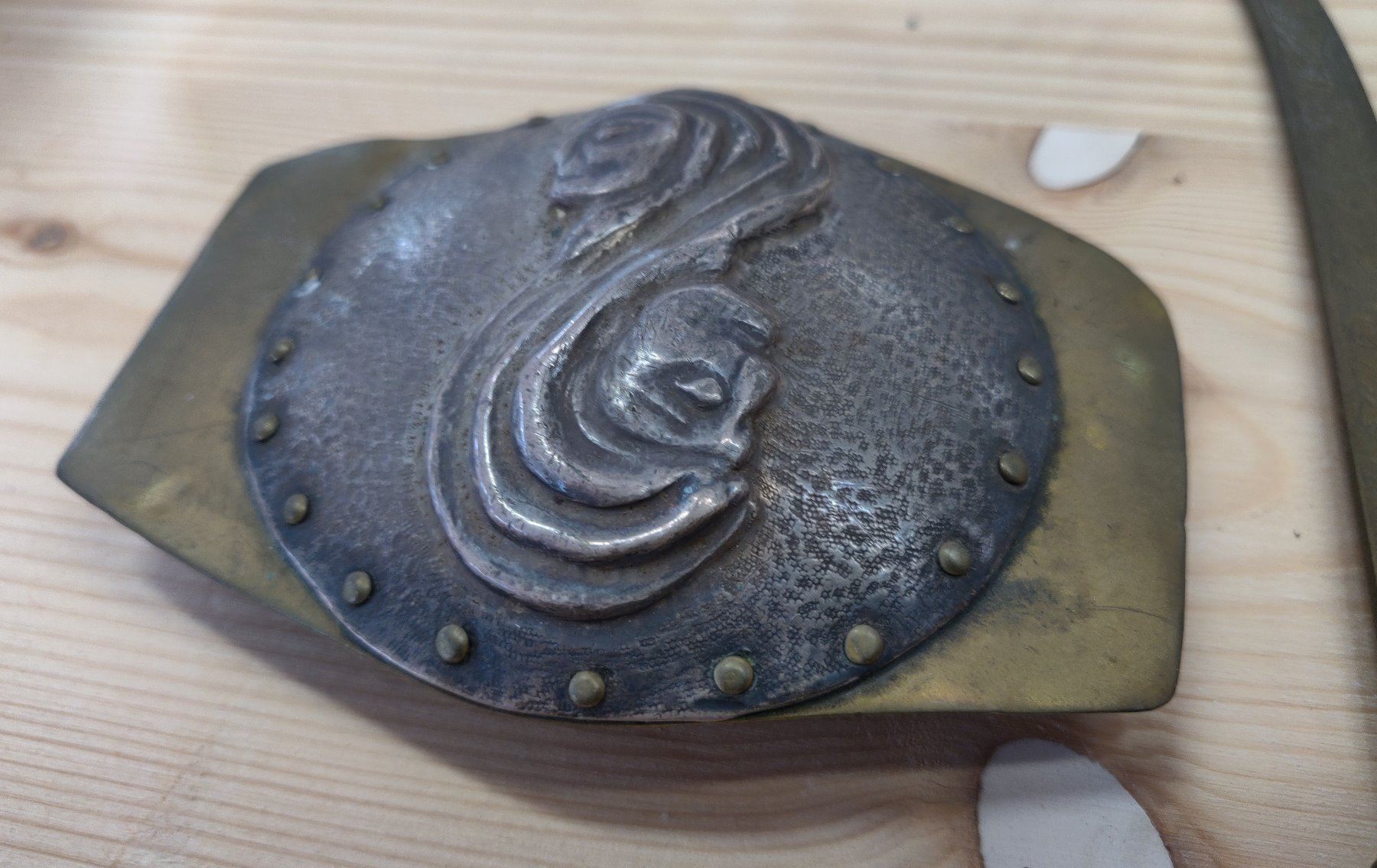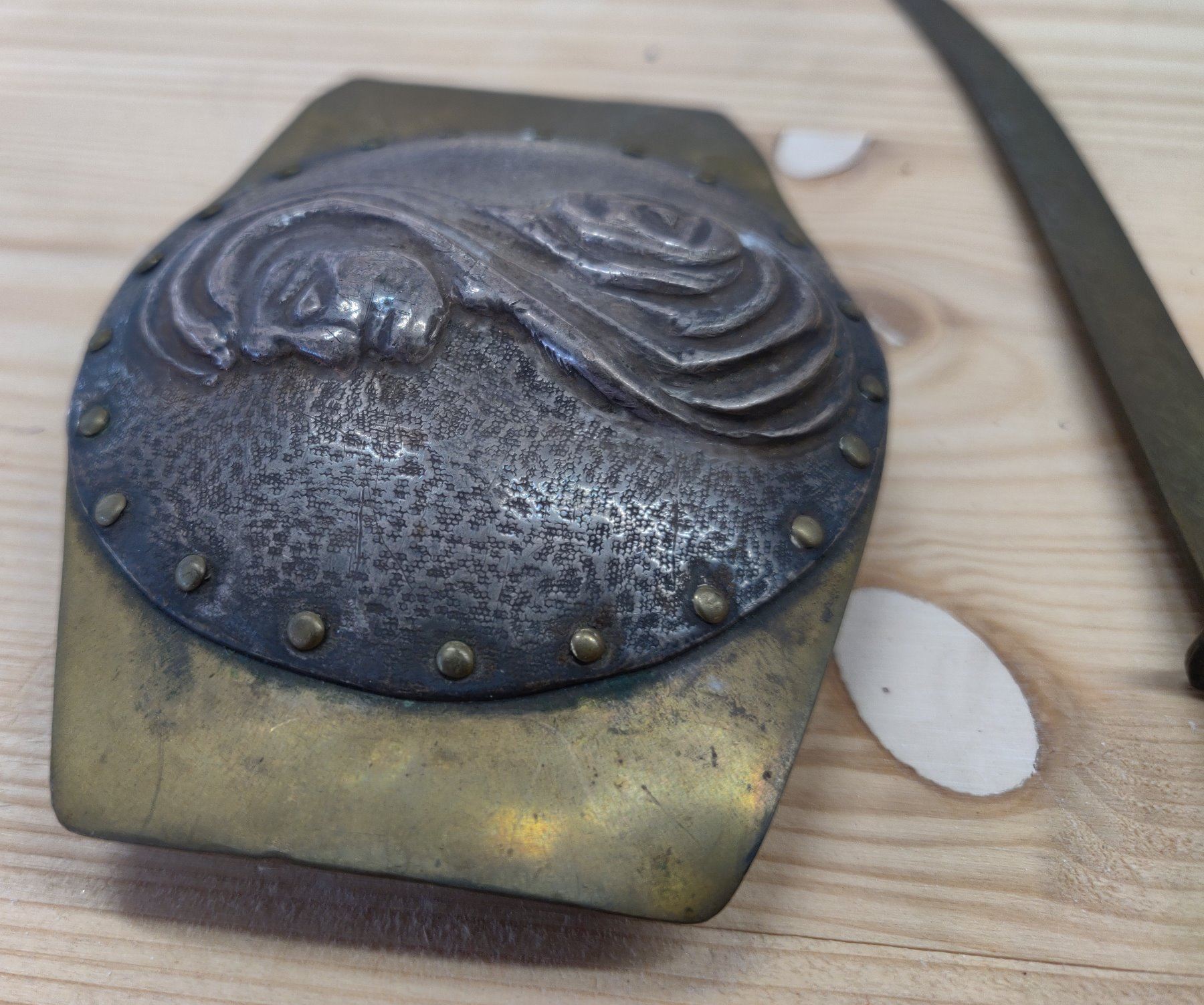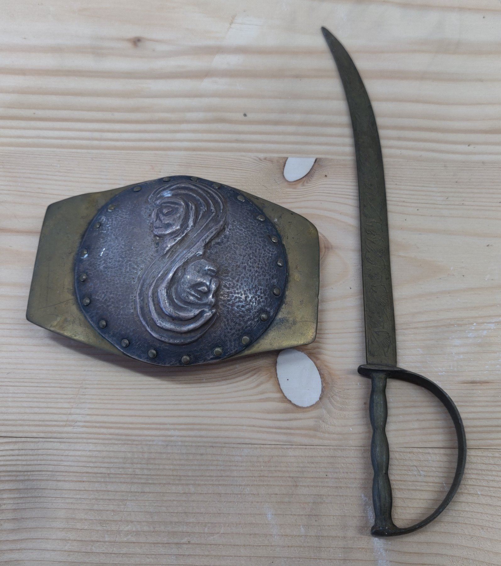 Middle Eastern Buckle & Sword, c. 1920s. Made of silver and bronze, the sword measures 8 3/4" and the buckle is 4". Middle Eastern. Condition: Good, patina, see images. Shipping: $18.50 w/insurance and signature.