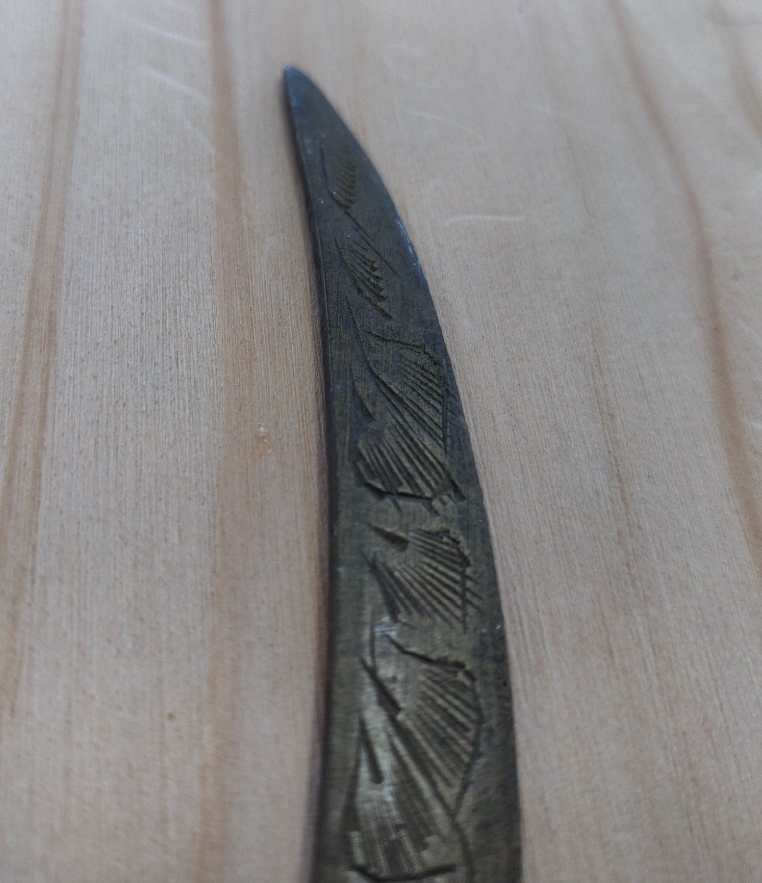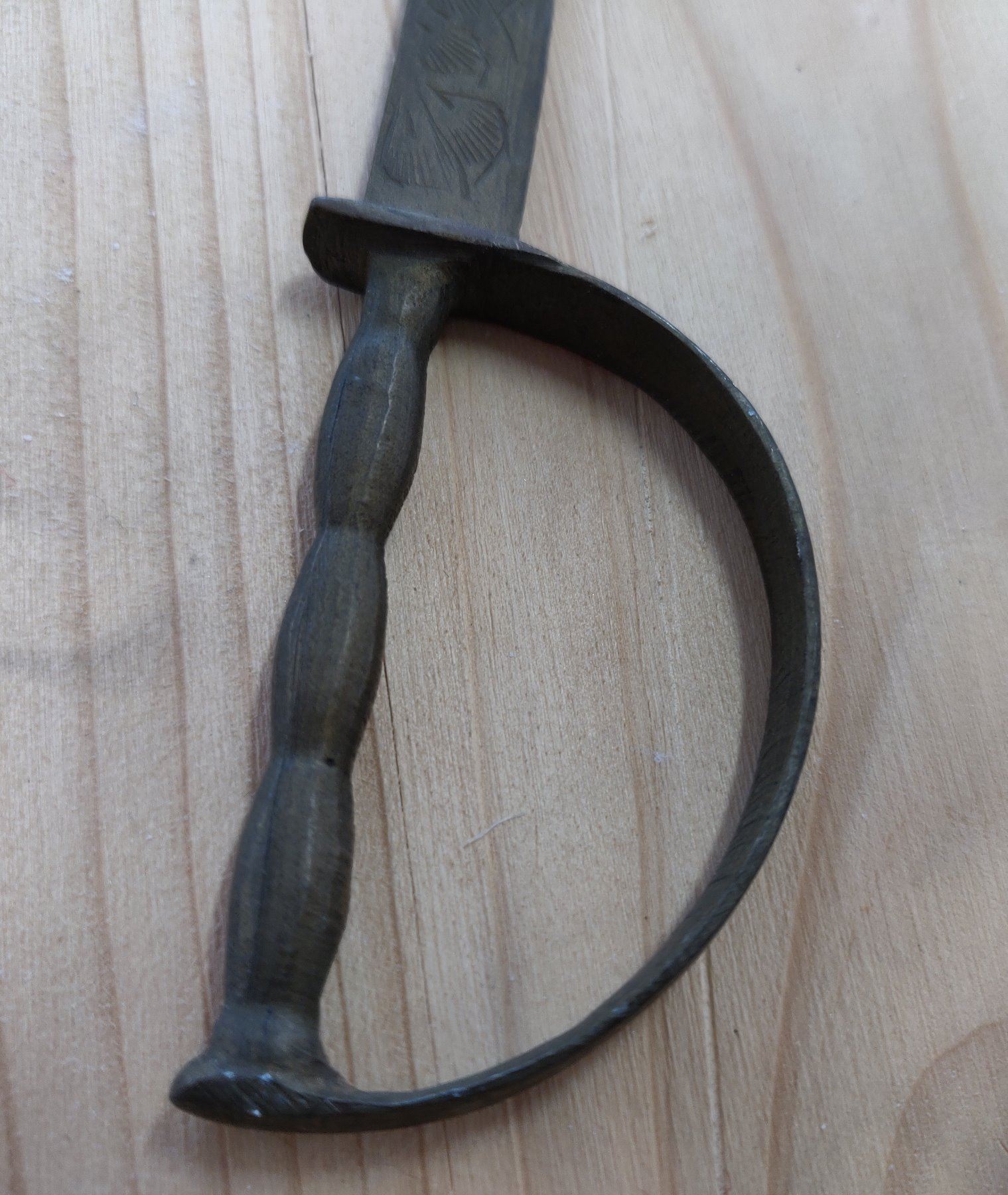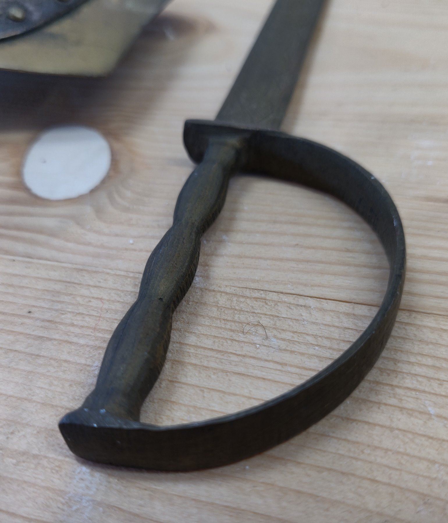 Middle Eastern Buckle & Sword, c. 1920s. Made of silver and bronze, the sword measures 8 3/4" and the buckle is 4". Middle Eastern. Condition: Good, patina, see images. Shipping: $18.50 w/insurance and signature.