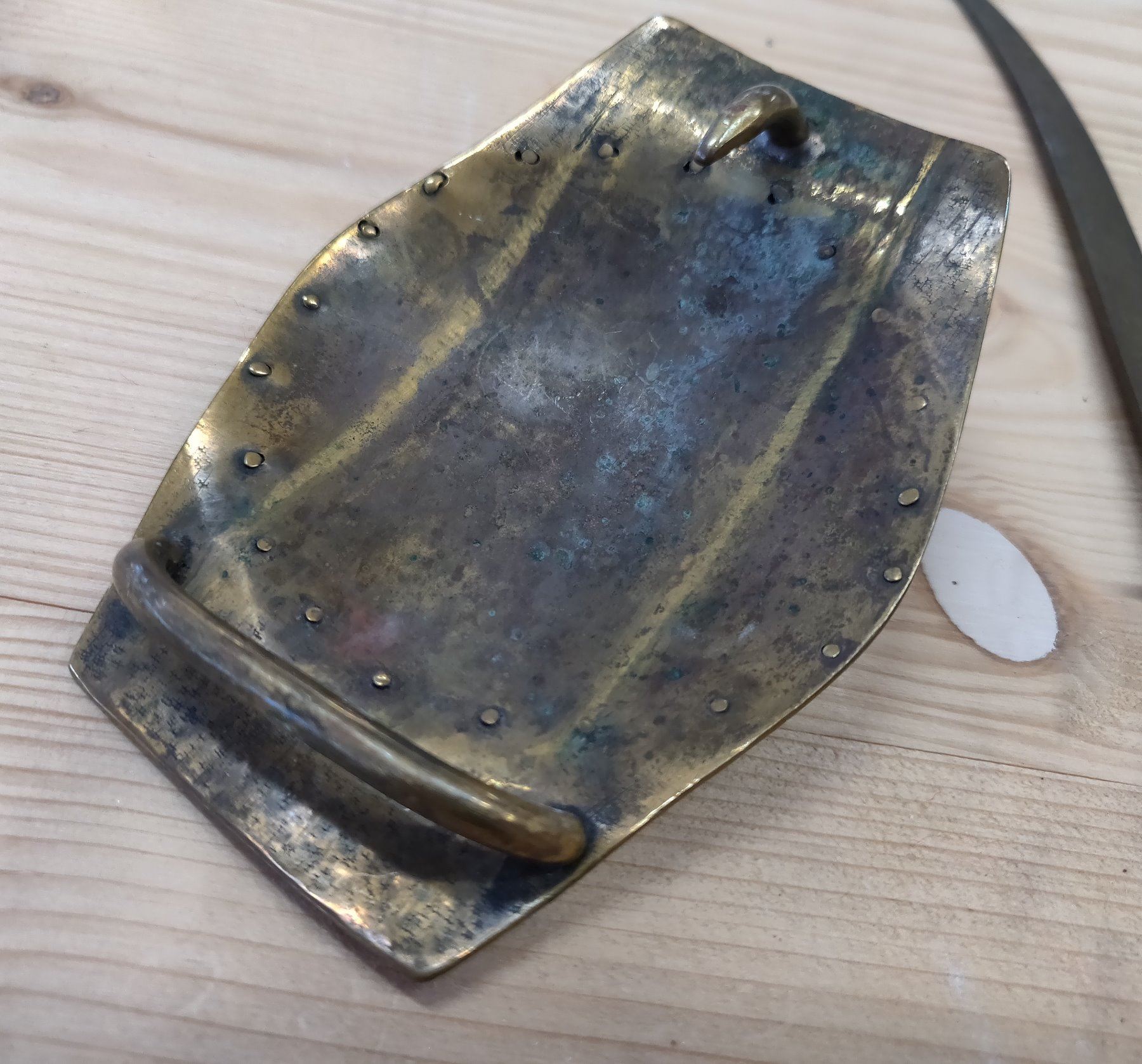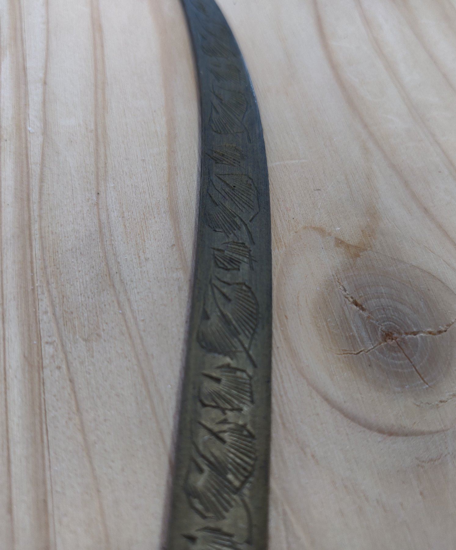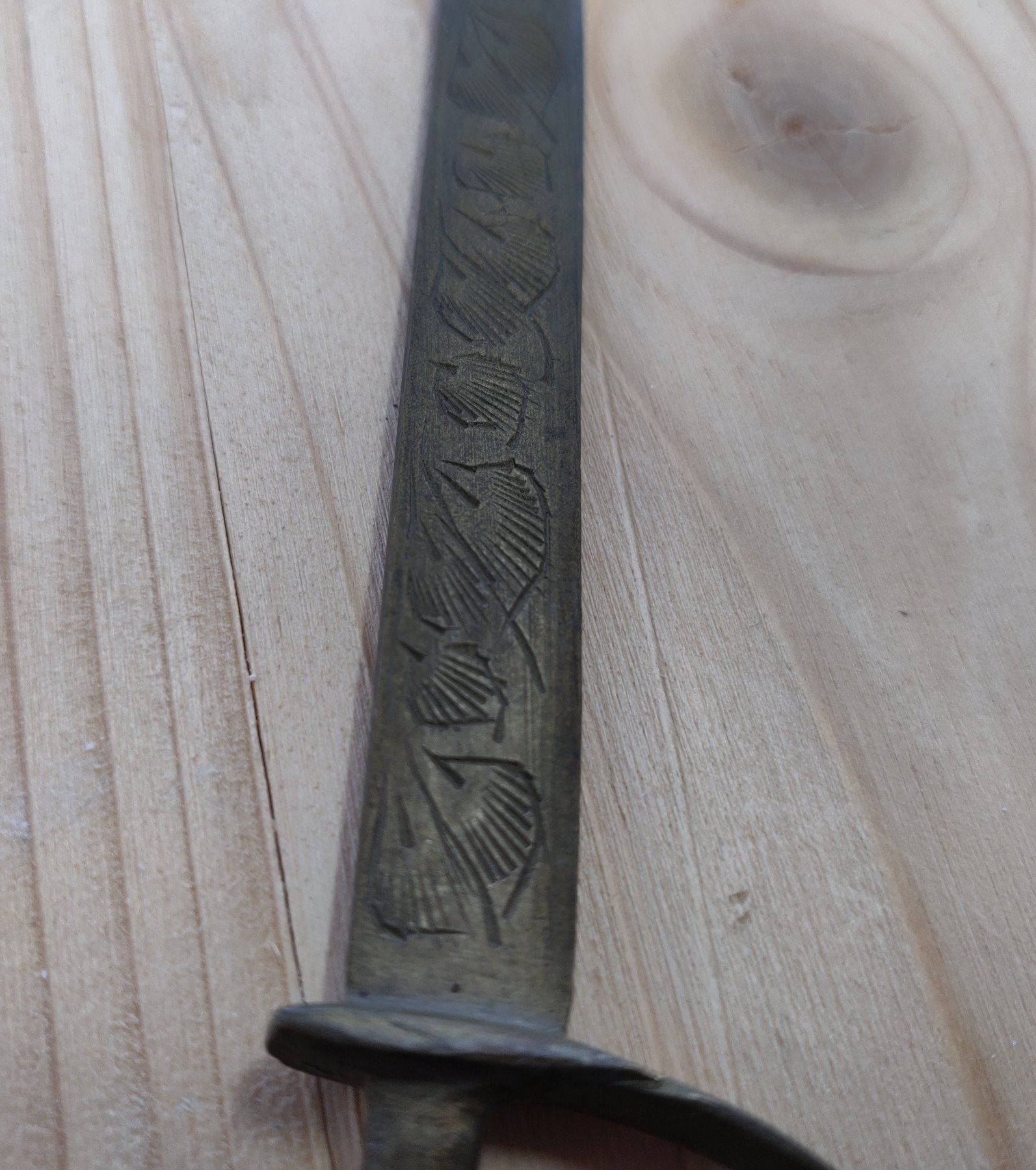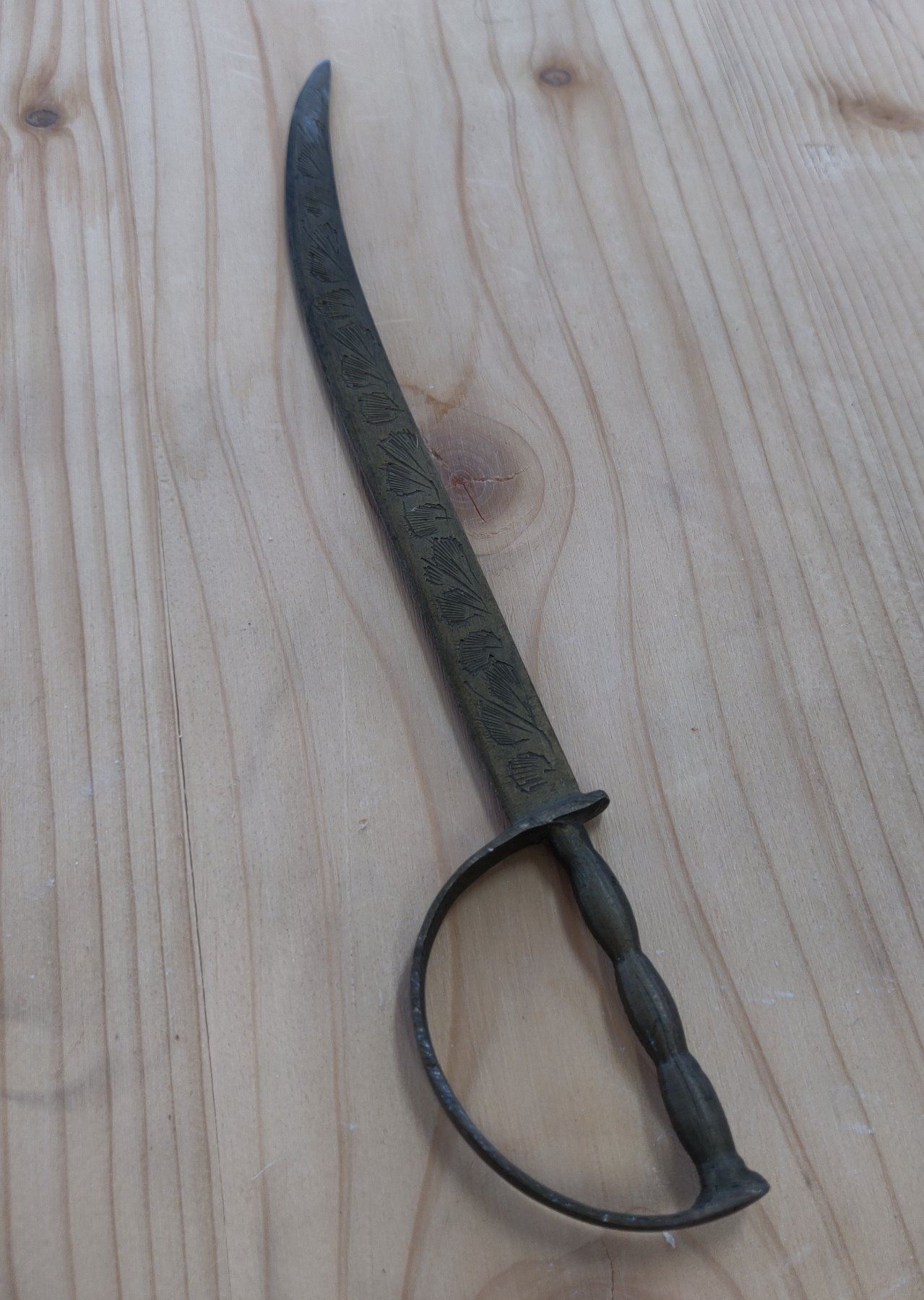 Middle Eastern Buckle & Sword, c. 1920s. Made of silver and bronze, the sword measures 8 3/4" and the buckle is 4". Middle Eastern. Condition: Good, patina, see images. Shipping: $18.50 w/insurance and signature.