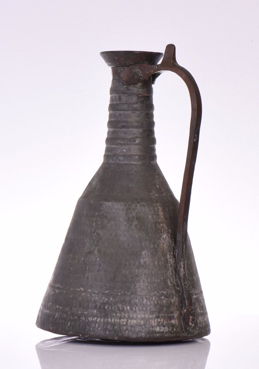 Middle Eastern Copper Ewer. Estimated more than 200 yrs old. Islamic art encompasses the visual arts produced from the 7th century onward by people who lived within the territory that was inhabited by or ruled by culturally Islamic populations. It is s very difficult art to define because it covers many lands and various peoples over1,400 years and it is not art specifically of a religion, or of a time, or of a place, or of a single medium. The huge field of Islamic architecture is the subject of a separate article, leaving fields as varied as calligraphy, painting, glass, pottery, and textile arts such as carpets and embroidery. Islamic art was developed from many sources such as Roman, Christian, Byzantine, Sassanian, Persian, Asian, all which had a formative effect on Islamic painting, pottery, and textiles. There are repeating elements in Islamic art, such as the use of geometrical floral or vegetal designs in a repetition known as the arabesque. Typically Islamic art has focused on the depiction of patterns, whether purely geometric or floral, and Arabic calligraphy. (Wikipedia) Size: See Ruler Photo. (Photos Represent The Condition Of The Lot.)