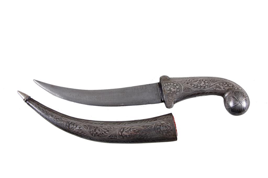 Middle Eastern Engraved Silver Knife Floral scrolling, measures 12 1/2" overall, blade is 6 1/2".Floral scrolling, measures 12 1/2" overall, blade is 6 1/2".