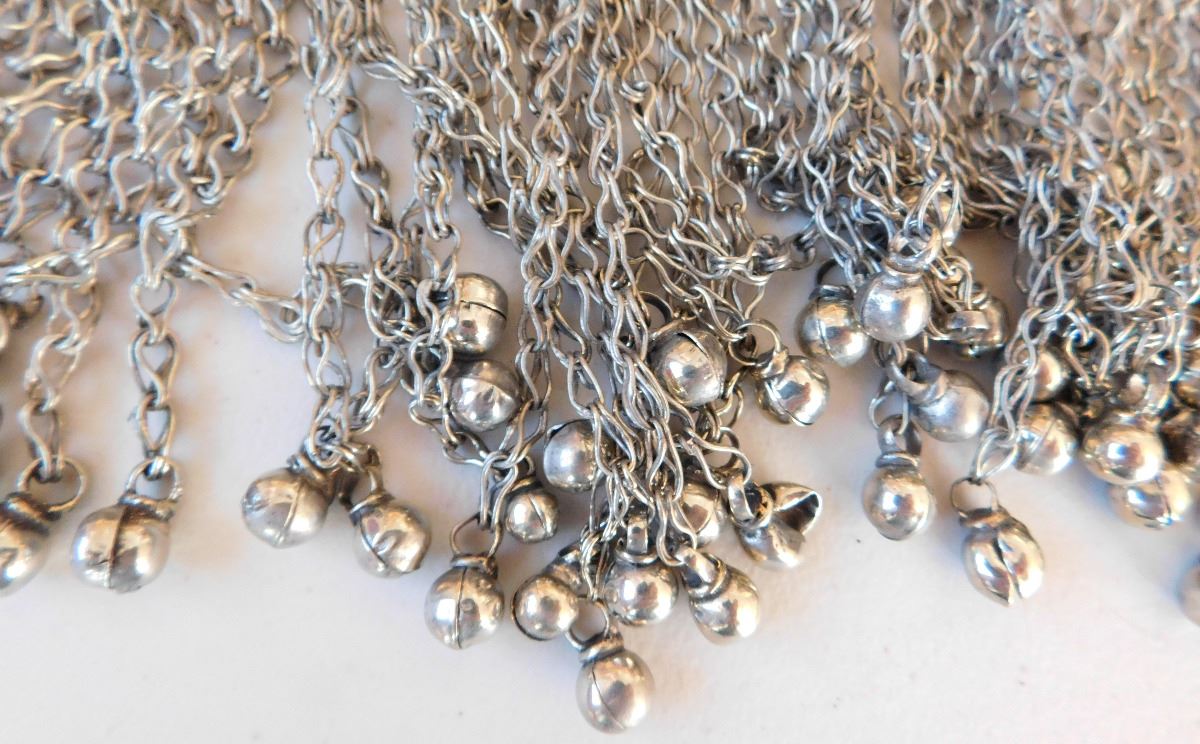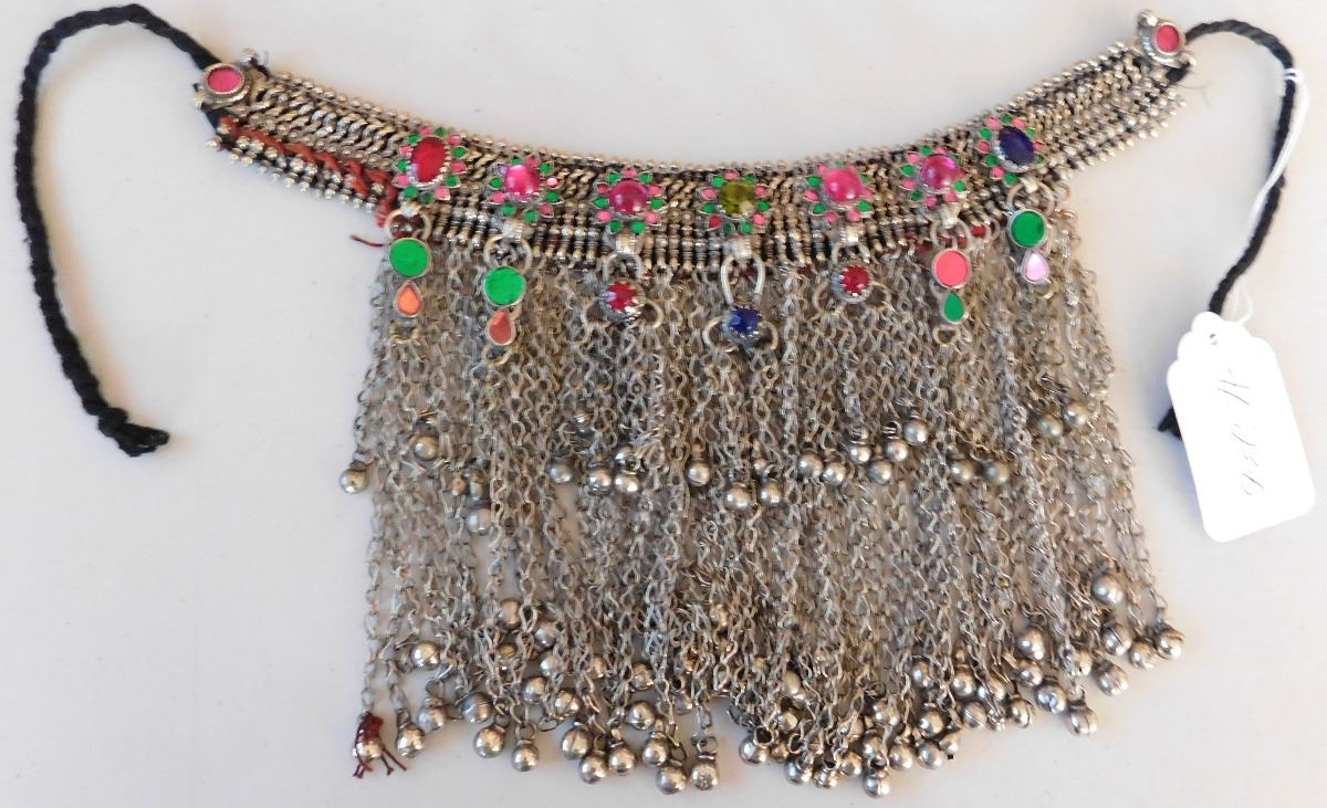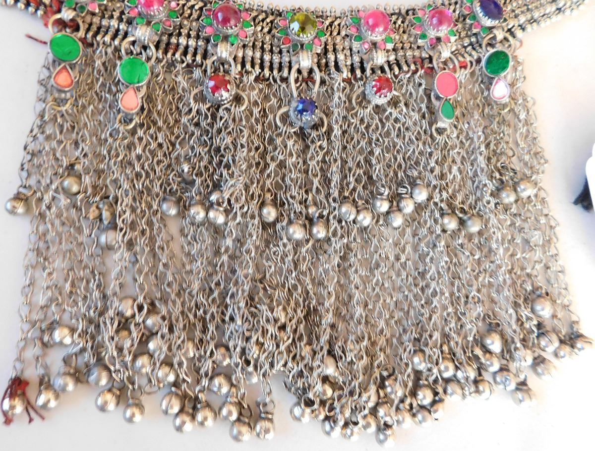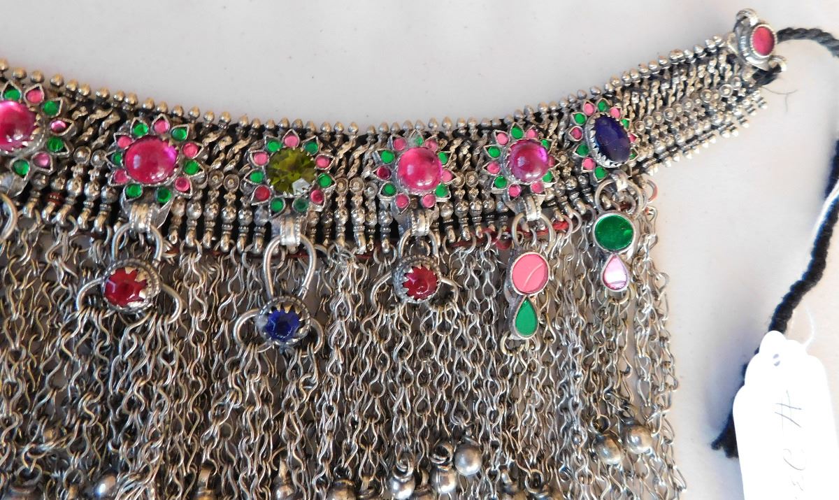 This is a Afghanistan massive necklace in a tribal style. It has glass beads and measures 17 x 7 inches. It is made from nickel silver. Shipping: $20