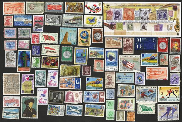 Lot of dozens of stamps, colorful, almost all used. Includes Ras Al Khaima, India and numerous other countries.