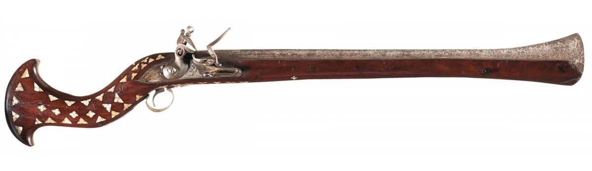 Manufactured without sights, with a widely flared muzzle and deeply cut floral and scroll patterns, possibly inlay channels, on top of the barrel. The lock is marked with a rearing lion in front of the hammer and the date "1818" stamped vertically behind the hammer. Mediterranean-style hooked stock with over 100 triangular and diamond shaped mother of pearl inlays on the sides of the buttstock, left stock flat and underside of the forearm.