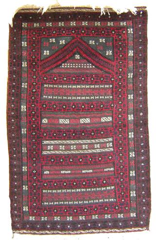 Oriental prayer rug of hand woven wool, from Baluchi, Afghanistan; near-mint condition. 56" x 34"
