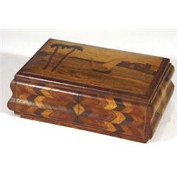 Middle Eastern multi coloured inlaid wooden box, decorated with sailing ships, palm trees and houses, 20cm wide