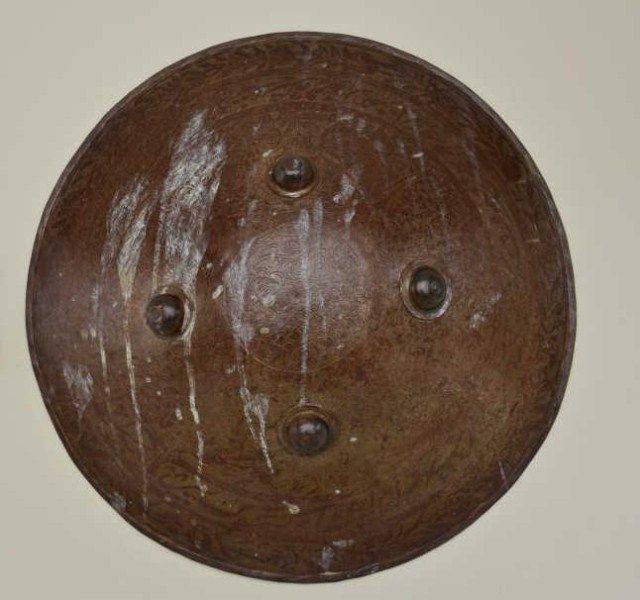 Middle Eastern shield with engraved decoration, circa 19th to 20th century measuring 22-1/2” across the center. The engraving shows court scenes, animals, horses, scrolls and prayers. There is acoating of residue or paint that will remove with a little work using steel wool. From an old Hollywood estate. Est.: $250-$500.