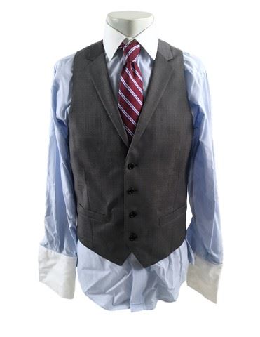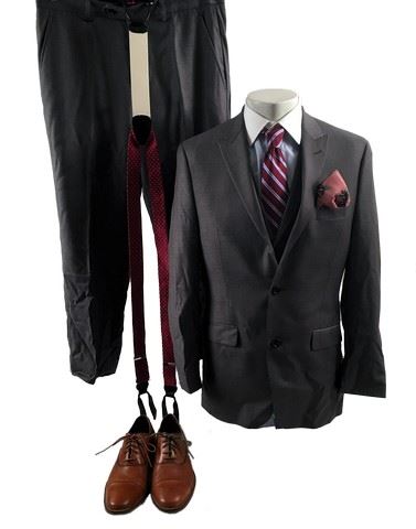 Principal Dwight (Andy Daly) screen worn, hero, charcoal grey slim fit two button and flap pockets 'Alfani' suit jacket with matching vest and pants, (size 38R - 34" x 32") burgundy, pink, blue, and green floral print cotton 'J. Crew' pocket square, burgundy with baby blue and white diagonal stripe 'Club Room' neck tie, pale blue long sleeve button front with collar and cuff 'Brooks Brothers' shirt, (size 15 1/2 - 33) and camel leather lace up the front cap toe 'Cole Haan' Oxford shoes. (size 9.5) Includes wardrobe tag.