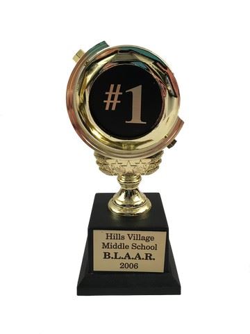 Principal Dwight (Andy Daly) screen used, #1 Hills Village Middle School B.L.A.A.R. 2008 wood and plastic trophy. (approx. 7 1/4" tall)