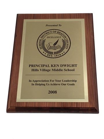 Principal Dwight (Andy Daly) screen used, Principal Ken Dwight Hills Village Middle School In Appreciation For Your Leadership In Helping Us Achieve Our Goals 2008 wall plaque. (approx. 12" x 9")