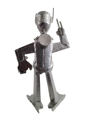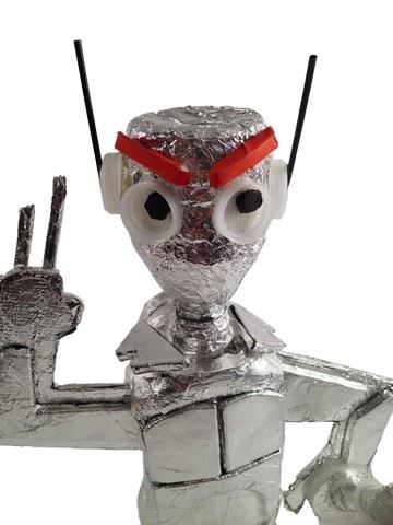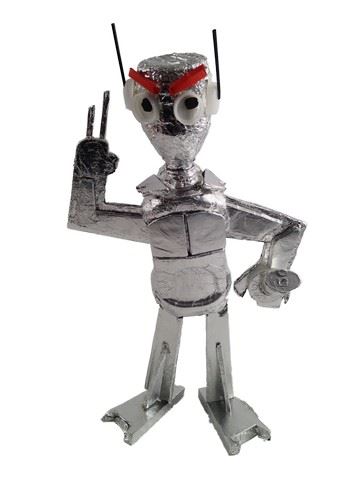 Screen used, from Rafe's (Griffin Gluck) room, this is a handmade foil robot. It is made from plastic water bottles and foil. Eyes and ears are made from water bottle caps. The robot is able to stand, but is very fragile. Antennas are made from small black straws. (16x10).