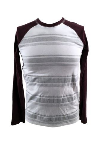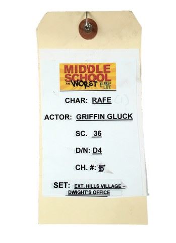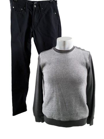 Rafe (Griffin Gluck) screen worn, hero, heathered grey crew neck long sleeve with dark grey raglan sleeves 'Vince' sweatshirt, (size XL) white long sleeve crew neck with soft red and grey horizontal stripes, soft red raglan sleeves 'Epic Threads' shirt, (size L) and navy five pocket cotton straight leg 'Old Navy' pants. (size 28) Includes wardrobe tag.