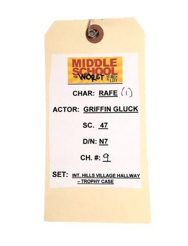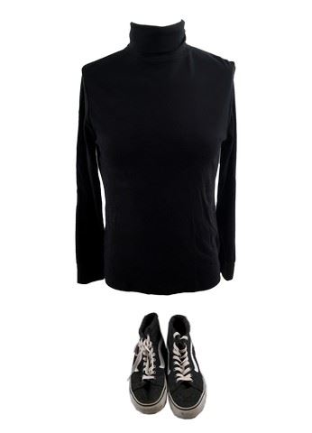 Rafe (Griffin Gluck) screen worn, hero, black long sleeve jersey turtleneck 'Circo' shirt, (size L) and dark grey lace up high top tweed with white soles 'Vans' shoes. (size 7.5) Includes wardrobe tag.