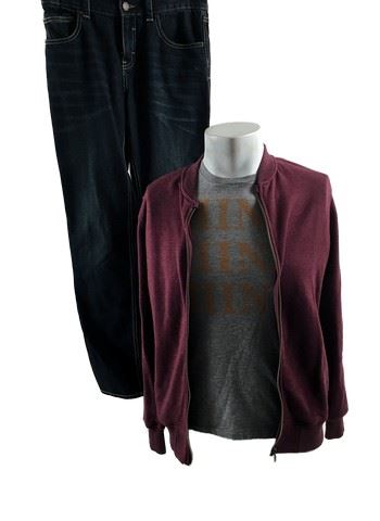 Rafe (Griffin Gluck) worn for still photo, light red long sleeve zipper front with pockets 'Zara Boys' sweatshirt, (size 13/14) grey short sleeve with logo on the front and back 'Disney Collection' t-shirt, (size 12) and dark blue denim 'Tucker + Tate' jeans. (size 14) Includes wardrobe tag.