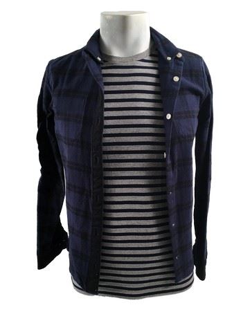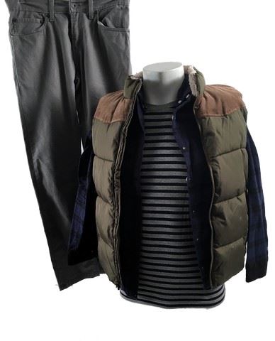 Rafe (Griffin Gluck) screen worn, hero, adhesive coated, olive green zipper front with brown corduroy at the shoulders and sherpa at the neck 'Crazy 8' vest, (size XL) navy and black plaid long sleeve button front flannel 'Abercrombie' shirt, (size 13/14) grey and navy striped short sleeve crew neck 'H&M' t-shirt, (size XS) and light grey wash five pocket 'Levis' skinny jeans. (size 28 x 28) Includes wardrobe tag.