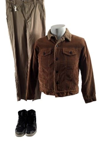 Rafe (Griffin Gluck) screen worn, hero, brown corduroy with fur lining long sleeve button front 'Gap Denim' jacket, (size XL) khaki straight leg pants, (size 14) and black and white lace up the front 'Nike' high top shoes. (size 7.5) Includes wardrobe tag.