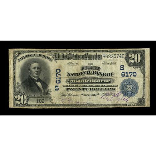 <B>Middlebourne, WV</B></I> - $20 1902 Plain Back Fr. 660 <B>The First NB</B></I> Ch. # (S)6170<BR>This is one of a mere 5 large on this bank and similar to the note we sold in September 2003 for $1610. Snap remains while the bottom edge shows a little bit of wear. <B>Fine.</B></I><BR><BR><b>Shipping:</b> Coin/Currency (<a target="_blank" href="http://www.heritageauctions.com/common/shipping.php">view shipping information</a>)