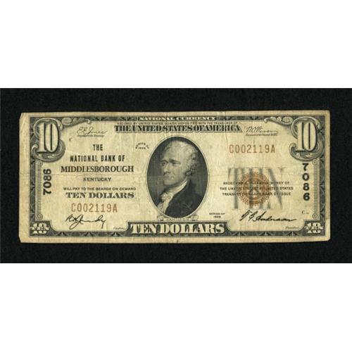 <B>Middlesborough, KY</B></I> - $10 1929 Ty. 1 <B>The NB of Middlesborough</B></I> Ch. # 7086<BR> A couple of pinholes are noted on this otherwise solid <B>Very Good.</B></I><BR><BR><b>Shipping:</b> Coins & Currency (<a target="_blank" href="http://www.heritageauctions.com/common/shipping.php">view shipping information</a>)