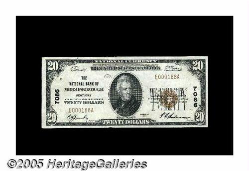<B>Middlesborough, KY</B></I> - $20 1929 Ty. 1 <B>The NB of Middlesborough</B></I> Ch. # 7086<BR>A crackling-fresh note with one sheet fold in the top margin, along with a small split in the same area. <B>Crisp Uncirculated.</B></I>