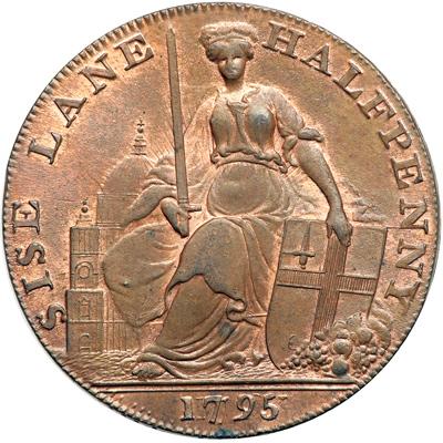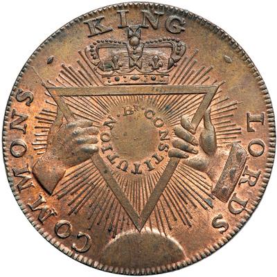 Middlesex. Davidson's. Halfpenny, 1795. D&H-295. Edge: PAYABLE AT THE HOUSE OF T. & R. DAVIDSONS. Female seated. Reverse: A crown upon a triangle, held by two hands. NGC graded MS-66 Red & Brown.