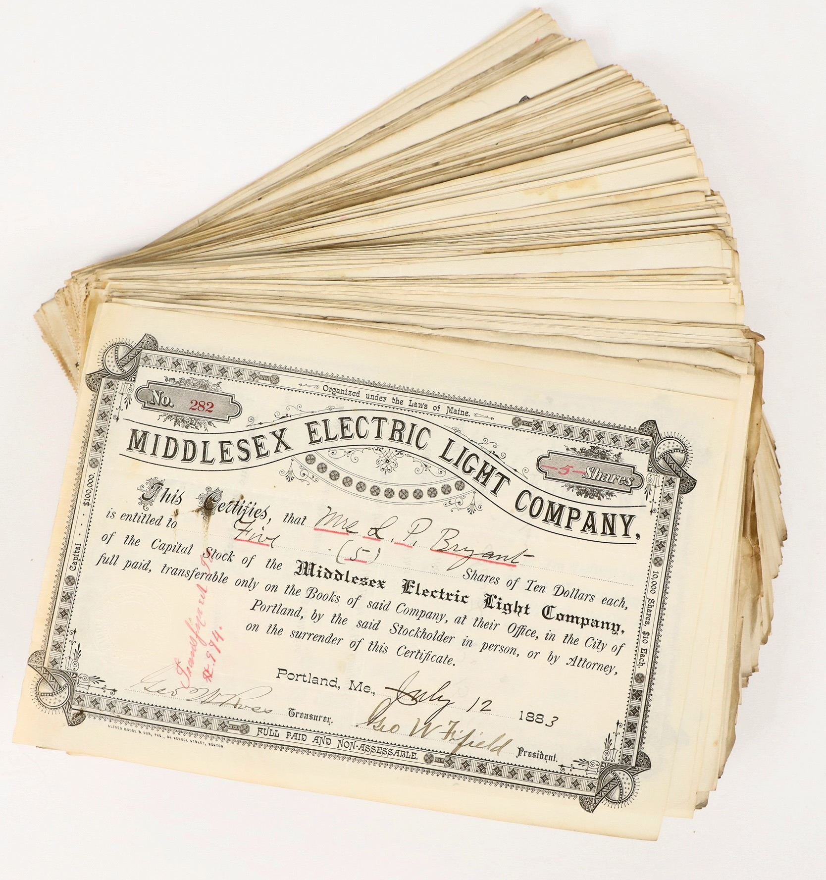 Middlesex Electric Light Co, 1883-1888, signed by George Fifield as president or Chas Kimball as VP. About 200 pcs. About a quarter of them show "