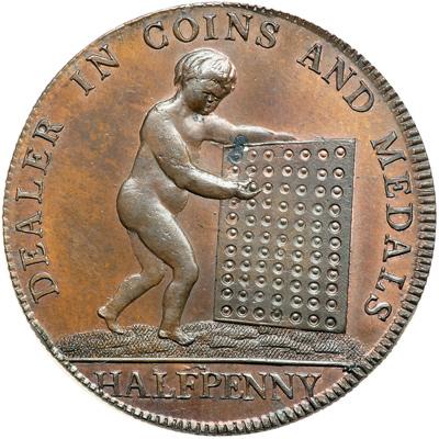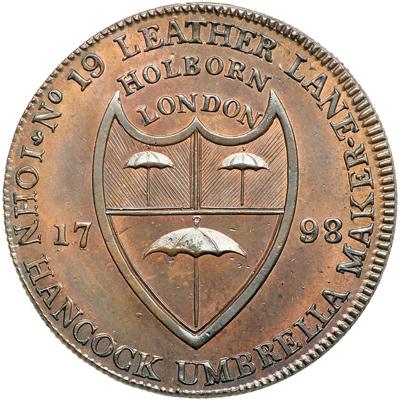 Middlesex. Hancock's. Halfpenny, 1789. D&H-322. Edge: Milled. Shield with three umbrellas. Reverse: A nude boy holding a coin tray. Rare. NGC graded MS-66 Red & Brown.