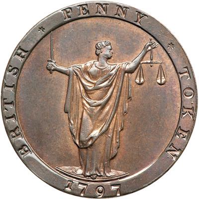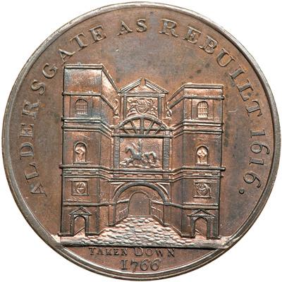 Middlesex. Kempson's. Penny, 1797. D&H-74. Edge: Plain. Kempson's Series of London Buildings. Aldersgate. Reflective fields. Scarce. NGC graded MS-66 Brown.