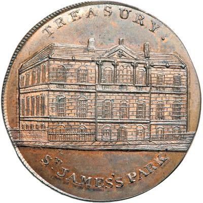 Middlesex. London and Westminster. Penny, 1797. D&H-88. Edge: I PROMISE TO PAY ON DEMAND THE BEARER ONE PENNY X. Treasury, St. James's Park. Rare. NGC graded MS-64 Red & Brown.