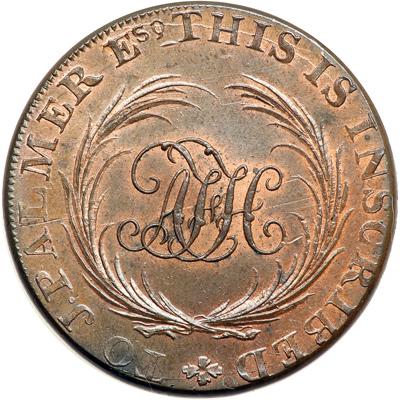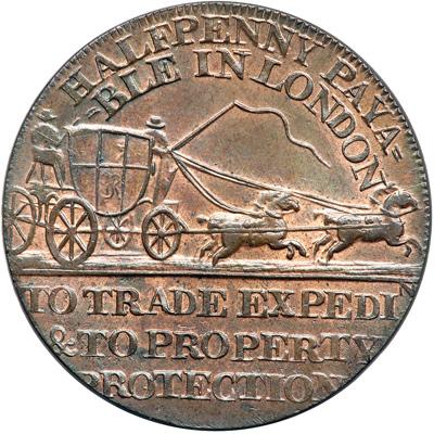 Middlesex. Mail Coach. Halfpenny, ND. D&H-366. Edge: Plain. A mail coach. Reverse: A cypher A F H. NGC graded MS-65 Red & Brown.