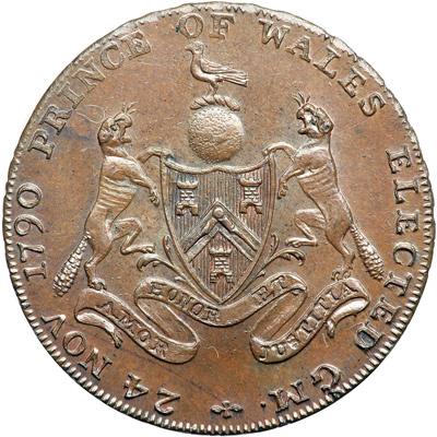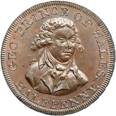 Middlesex. Masonic. Halfpenny, 1790. D&H-367. Edge: PAYABLE IN LANCASTER LONDON OR BRISTOL. The Freemason's Arms. Reverse: Bust of George Prince of Wales. NGC graded MS-66 Brown.