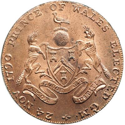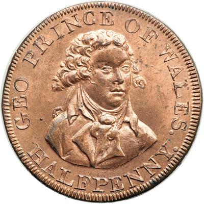Middlesex. Masonic. Halfpenny, 1790. D&H-367a. Edge: PAYABLE AT LONDON OR DUBLIN X. X. The Freemason's Arms. Reverse: Bust of George Prince of Wales. NGC graded MS-66 Red & Brown.