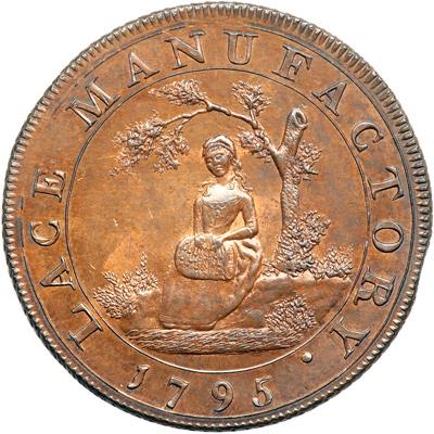 Middlesex. Moore's. Halfpenny, 1795. D&H-389. Edge: Milled (coarse). A girl sitting under a tree making lace. Reverse: Inscribed scroll. NGC graded MS-65 Red & Brown.