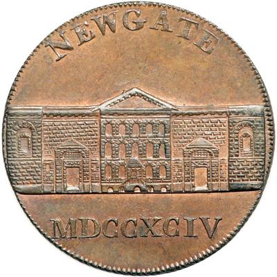 Middlesex. Newgate. Halfpenny, 1794. D&H-393. Edge: Milled. Front view of prison. Reverse: Legend. NGC graded MS-65 Brown.