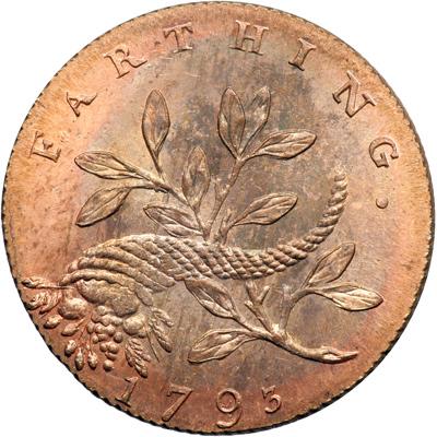 Middlesex. Newton. Farthing, 1793. D&H-1151. Edge: Milled. Bust to left. SR. ISSAC NEWTON. Reverse: A cornucopia and olive branch. NGC graded MS-66 Red & Brown.