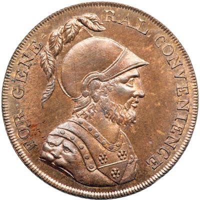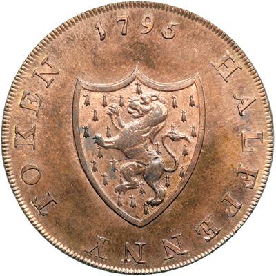 Middlesex. Political and Social Series. Halfpenny, 1795. D&H-1018a. Edge: Milled. A helmeted bust right. Reverse: Shield of arms. NGC graded MS-66 Red & Brown.