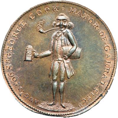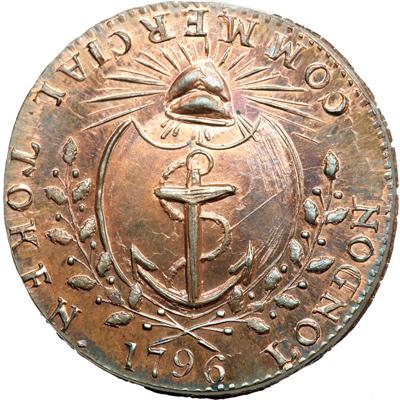 Middlesex. Prattent's. Halfpenny, 1796. D&H-460. Edge: Plain. Radiated Liberty cap above an anchor in a shield, between sprigs of laurel. Reverse: A man smoking. Reflective fields with lovely mint brilliance. Rare. NGC graded MS-65 Red & Brown.