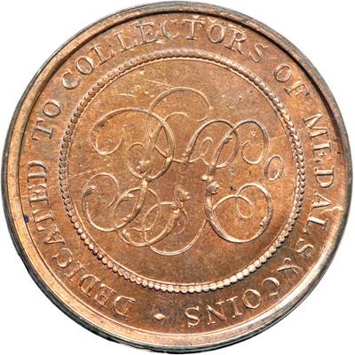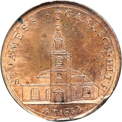 Middlesex. Skidmore's. Halfpenny, ND. D&H-586 (RR). Edge: Plain. St. James's. Garlick. Bith. Reverse: Cypher. NGC graded MS-63 Red & Brown.